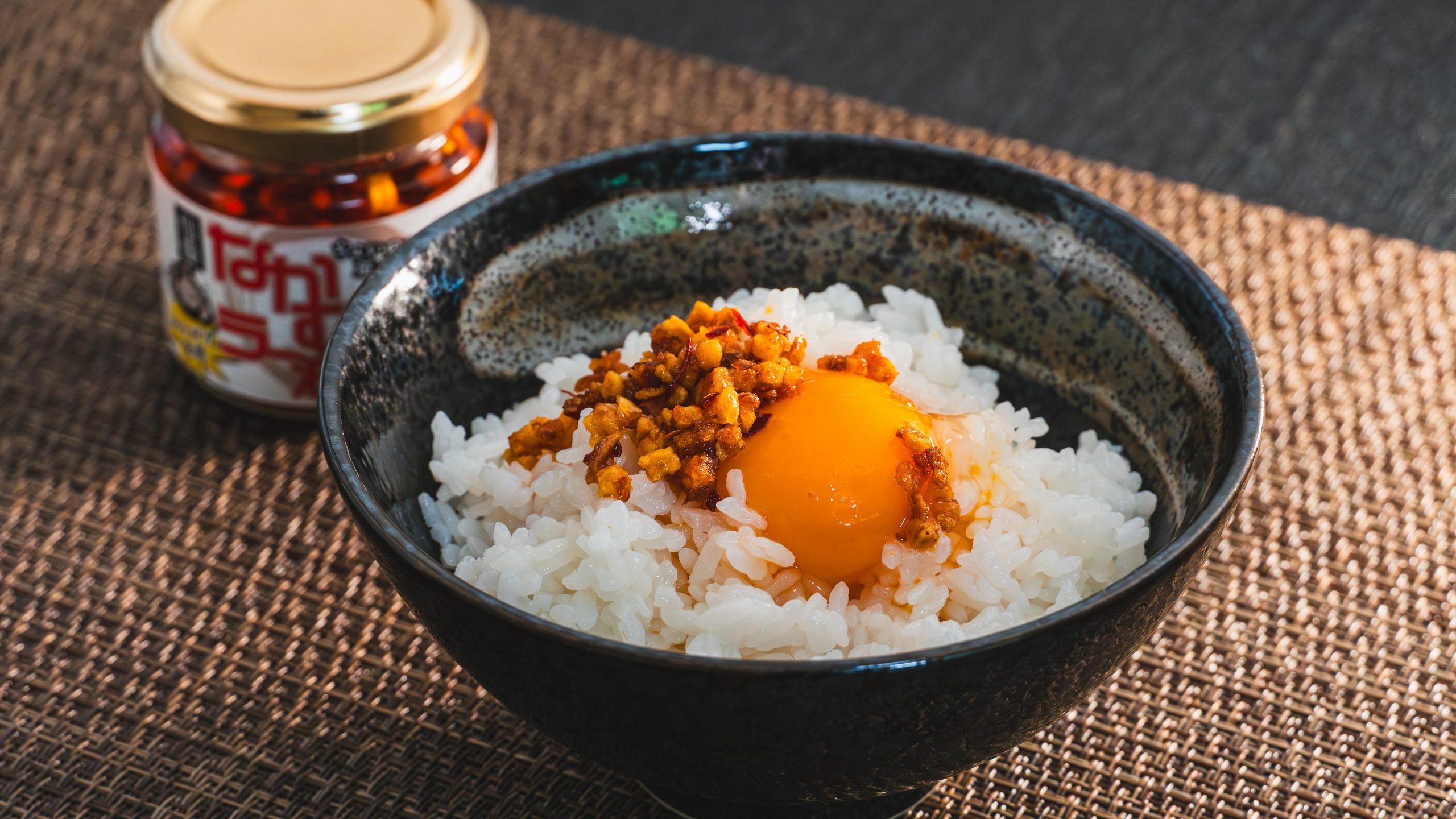 材料:ごはん茶碗1杯分、生卵、なかむラー油 黒ラベルまたは零